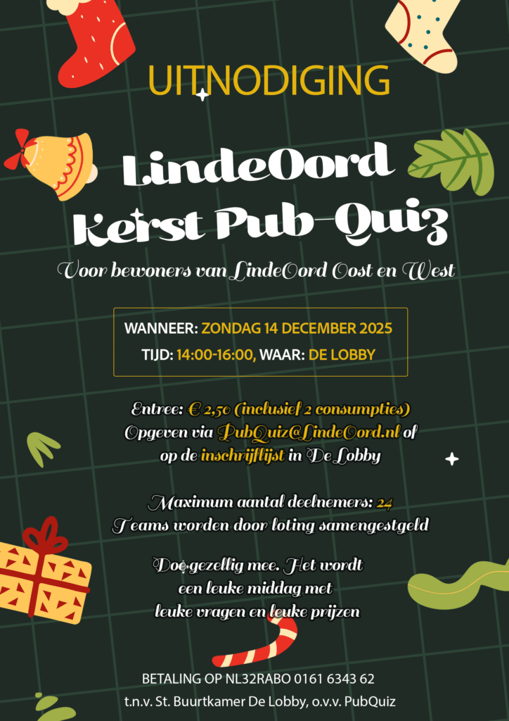 Op zondag 14 december organiseren we een LindeOord Kerst Pubquiz, speciaal voor alle bewoners van LindeOord Oost en West.